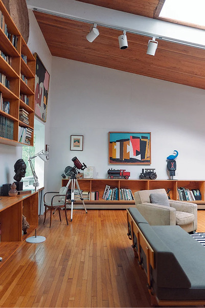 In 1971, upon retiring from Yale—Serge connected the main house to his studio down a small flight of stairs. The great room is a 28 foot square room with a giant skylight with paintings and floor to ceiling bookshelves reaching up to the ceilings. This great room attaches to a smaller 1 bedroom and bath studio with a full open kitchen onto a deck overlooking the pond. The apartment and great room are offered as a single unit or can be separated from the main house or rented together.